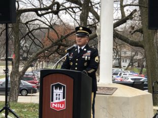 Third-year law student Edwin B. Esmenda spoke at an NIU Veteran’s Day ceremony celebrating the courage and self-sacrifice of our service members, past and present. Staff Sergeant Esmenda is a 20-year veteran of the United States Army. He was deployed overseas to Operation Uphold Democracy in Haiti in 1994, to Operation Iraqi Freedom in Iraq in 2006, and to Operation Enduring Freedom in Afghanistan in 2010. He is the Post Commander of Sycamore Post 5768 and the Department of Illinois Veterans of Foreign Wars (VFW) Assistant Judge Advocate for 2018-2019. He is also the Judge Advocate of American Legion Sycamore Post 99 for 2018-2019. He is currently a law intern in the Office of General Counsel, Illinois Department of Veterans Affairs (IDVA) in Chicago, Illinois. Thank you to Staff Sergeant Esmenda and all the brave men and women for your service!