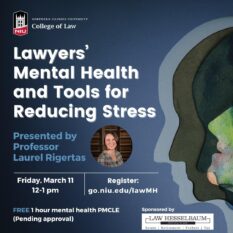 Register Now and join the NIU College of Law for a free CLE program on Lawyers’ Mental Health and Tools for Reducing Stress. on Friday, March 11 from 12-1 pm presented by NIU Law Professor Laurel Rigertas and sponsored by Law Hesselbaum.